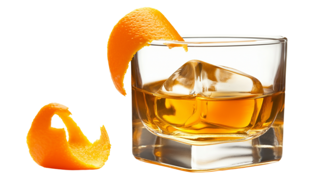 Classic cocktail with ice sphere and orange peel, isolated, no background.