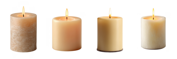 Set Of Decorative Burning Candles With Soft Lighting And Wax Variations Isolated on Transparent Background