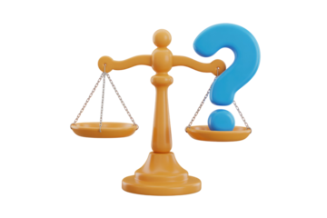 A 3D rendering of scales of justice with a question mark, symbolizing uncertainty and legal questions. background removed