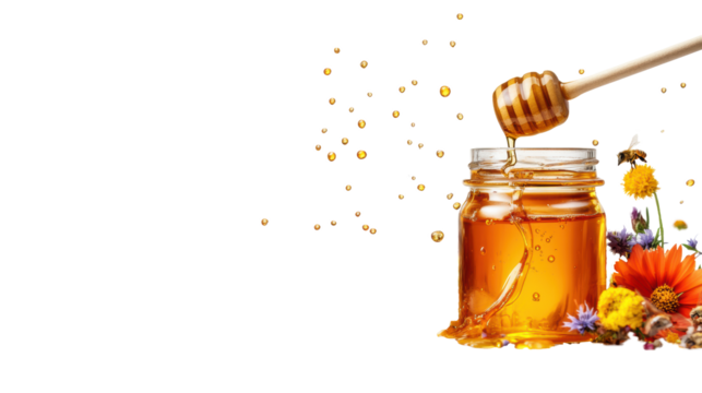 Golden honey drips from a wooden dipper, highlighting its natural sweetness and texture