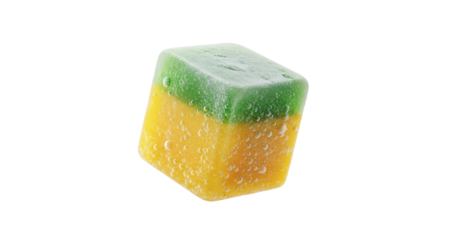 Captivating close-up of a dual-toned cube candy with shimmering bubbles, showcasing vibrant colors and geometric simplicity perfect for digital