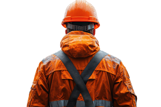 A construction worker in an orange jacket and hard hat stands observed from the back, ready for work against a white isolated background.