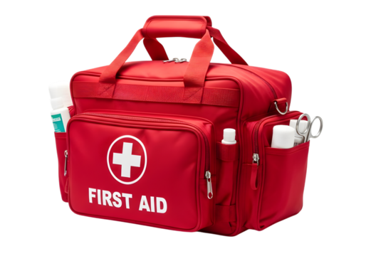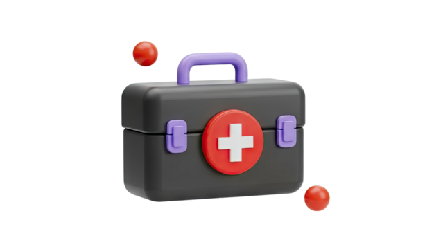 red first aid kit with white medical cross symbol isolated on black background for emergency