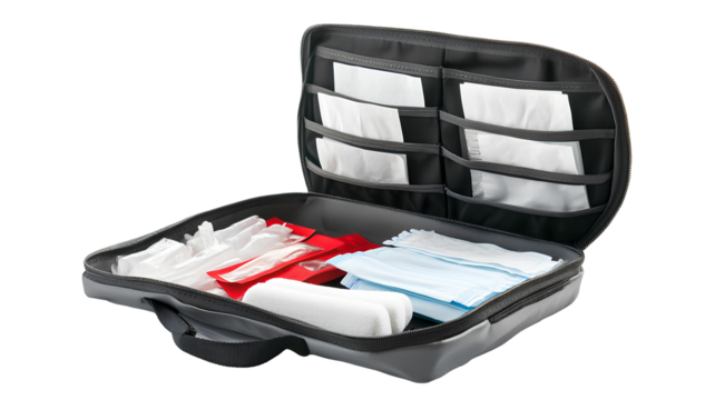 Ambulance bag with medicines, black and red, isolated on a white or transparent background. Emergency medical bag close up, side view. Medical theme design element.