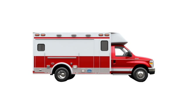 standard Emergency Ambulance with Red and White Markings, side view, isolated on a transparent background.