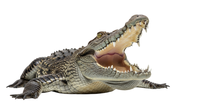 Crocodile lying in wait near the water's edge ready to strike, white background for clipping