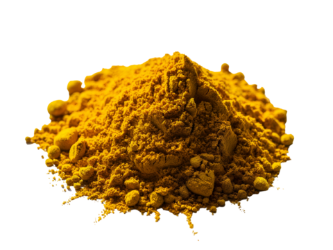 Heap of vibrant golden yellow powder, possibly a culinary spice like turmeric, dried mango powder (amchoor), or natural pigment, meticulously isolated on a clean white background for various uses