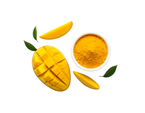 Golden Amchoor powder in a bowl with juicy mango wedges. High-contrast still life of the tropical fruit spice, isolated on a white background.