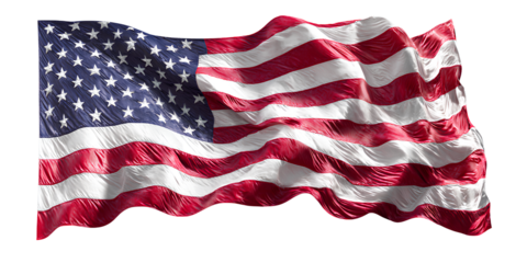 A flying American flag with stars and stripes, isolated on a transparent background, PNG