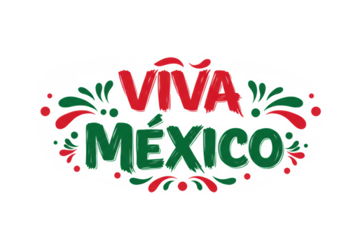 Vibrant 'VIVA México' in bold red/green brushstrokes, framed by festive Mexican flag flourishes on transparent background with copy space, celebrating national pride
