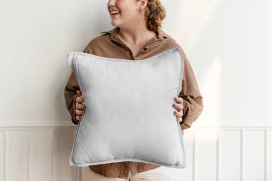 Smiling woman holding red heart-shaped fluffy cushion transparent background