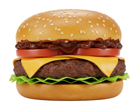 Deliciously prepared beef burger with fresh lettuce, ripe tomatoes, and red onion slices layered with melted cheese on a toasted bun