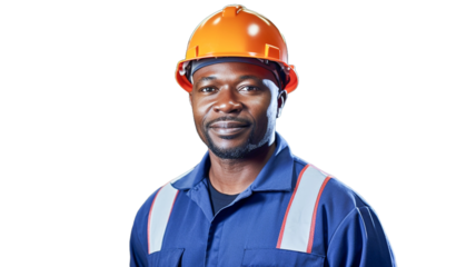 A smiling, professional african american engineer in a hardhat on transparent background PNG.