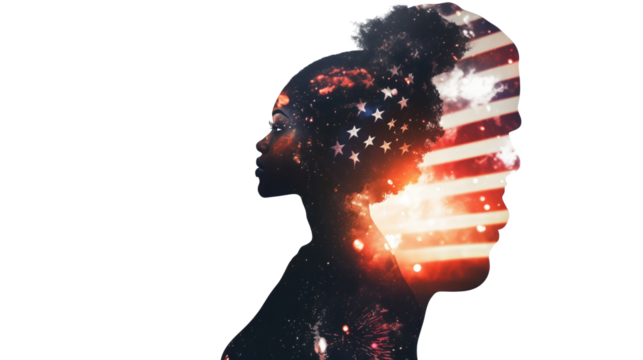 A double exposure of an African American woman's silhouette filled with the American flag and fireworks in space, cinematic, white copy space, - Generative AI