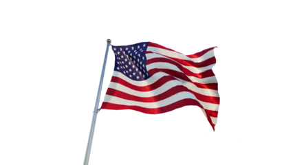 The American flag waves proudly on a flagpole symbolizing freedom and patriotism with its iconic red, white, and blue design.PNG, transparent background
