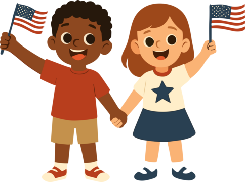 Patriotic child holding flags beside soldier on transparent background