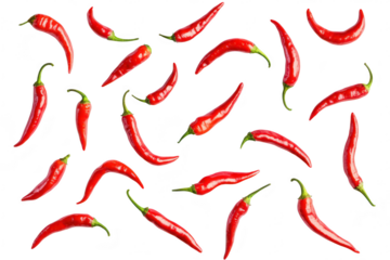 A arrangement of fresh red chili peppers scattered on a clean white background. highlighting their glossy texture and natural shape. ideal for culinary or food-related uses