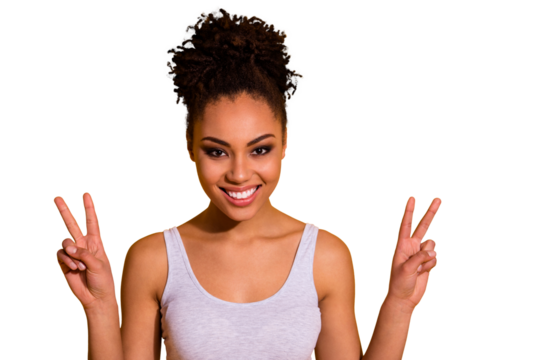Close up photo beautiful amazing funny she her dark skin lady show white perfect ideal teeth carefree weekend vacation v-sign symbol hands arms wear casual tank-top isolated vivid yellow background