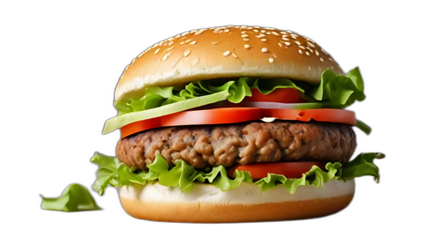 Delicious Hamburger With Cheese, Lettuce, Tomato, and Onion. On a White or Clear Surface PNG Transparent Background.