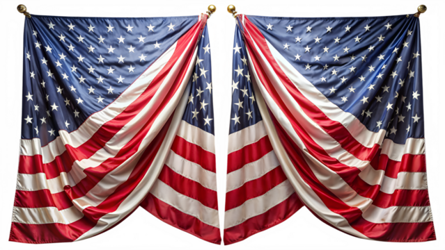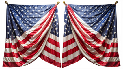 Two american flags elegantly draped and displayed against a transparent background, symbolizing national pride and formal presentation