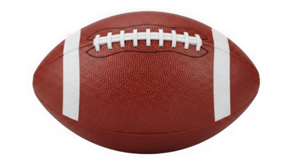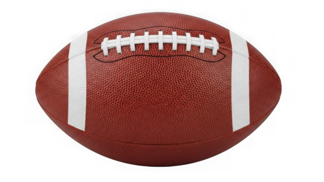 A close-up view of a standard American football, showcasing its distinctive texture and white stripes against a dark background.