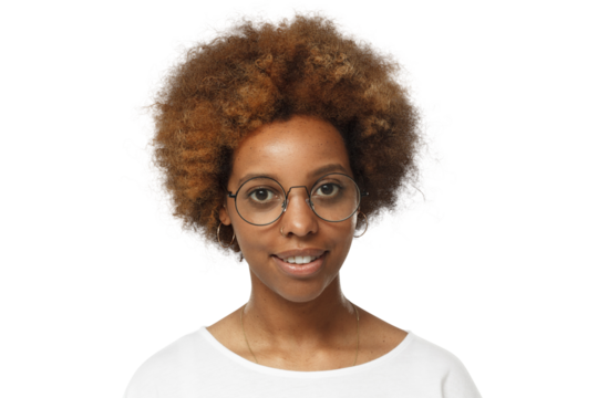 Portrait of smiling young african american woman wearing white t-shirt and round glasses