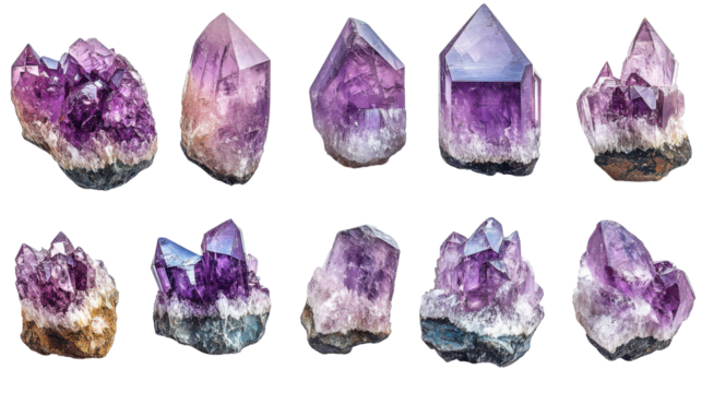 Cluster of violet purple crystal amethyst stones with sharp geometric points and rough base isolated on a transparent background