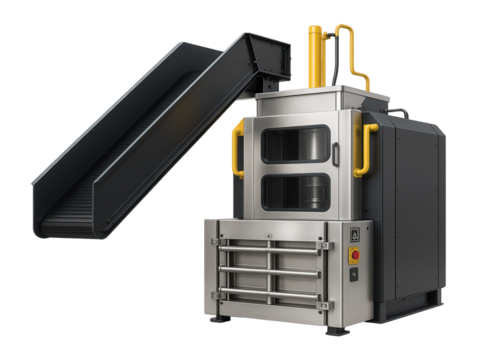 High-capacity container press with a conveyor belt feed system for continuous waste processing in industrial zones.