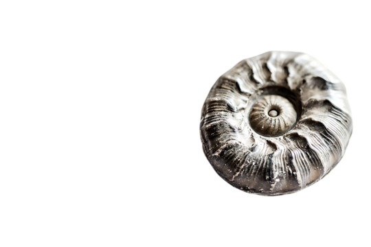 Close-up of an ammonite fossil revealing intricate spiral patterns, isolated on a transparent background