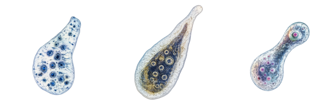 A set of moving amoebas under a microscope, isolated on transparent Background