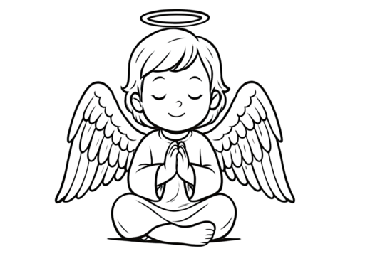 Cute praying baby angel with halo and detailed wings peaceful spiritual illustration sitting cross-legged for holiday artwork isolated on white background