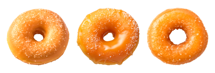 Donuts with a golden brown glaze and varying amounts of sugar crystals arranged in a row on a transparent background