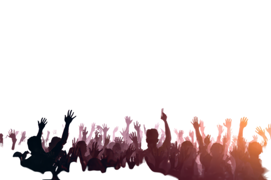People raise hands in excitement during an outdoor event at sunset in a lively urban setting
