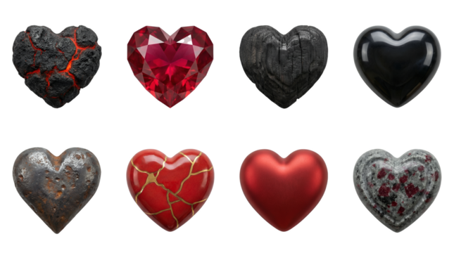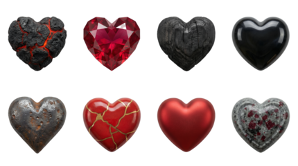 Heart shape collection including gemstone, volcanic lava, charcoal, obsidian, rusted metal, kintsugi, and matte steel variants isolated. Romantic concept and symbol set.