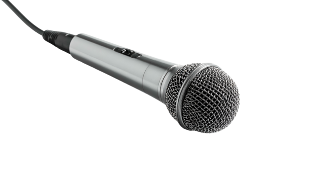 Black microphone with a silver mesh head ideal for music posters, sound recording websites, podcast graphics, and entertainment industry designs.