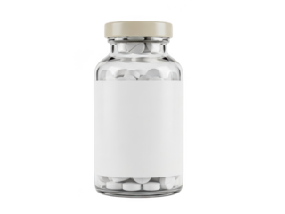 Clear glass vial with silver cap and blank label for customizable contents, isolated on transparent background, png