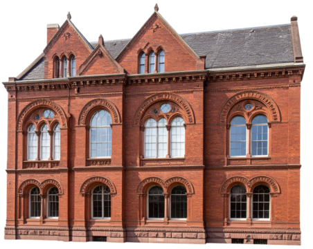 Classic Brick Building with Arched Windows, side view, isolated on transparent background