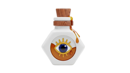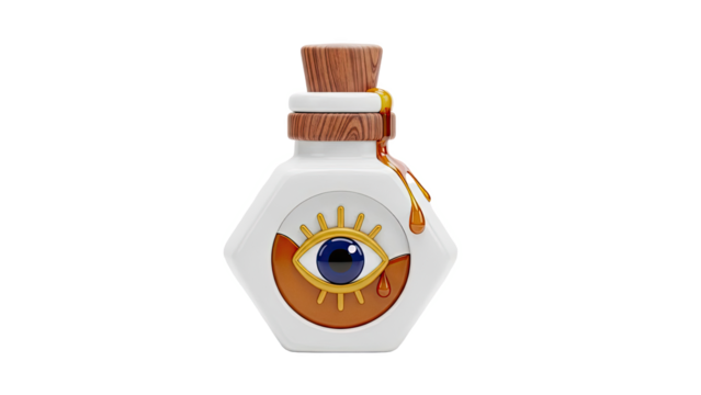 Hexagonal Potion Bottle with All-Seeing Eye and Dripping Amber Liquid