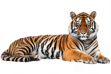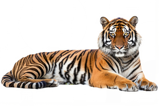 big tiger lying isolated , Tiger lays down with its eyes wide open.