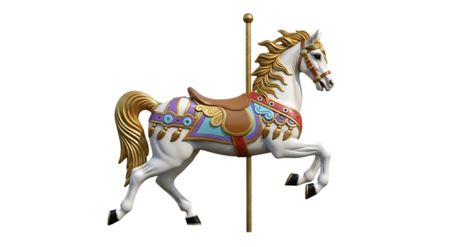 Ornate white carousel horse, with golden mane and tail adorned with colorful saddle and bridle, isolated on transparent background, PNG