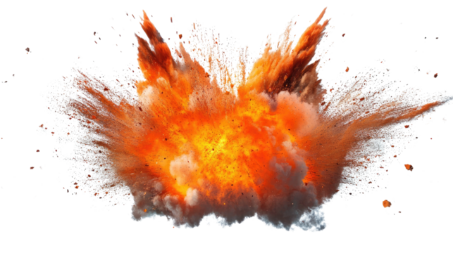 Powerful explosion with flying fragments and black smoke. Transparent background. Generative Ai