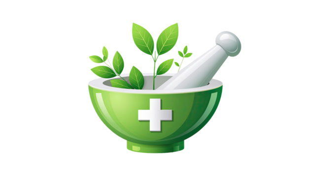 Green herbal medicine logo featuring mortar and pestle isolated on white background