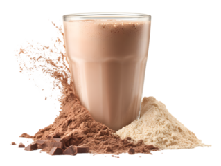 Chocolate protein shake preparation: A visually striking image showcasing the making of a chocolate protein shake. Featuring a glass brimming with the finished drink.