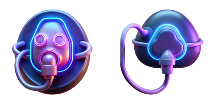 High quality photo of futuristic medical oxygen masks with neon lighting isolated on transparent background