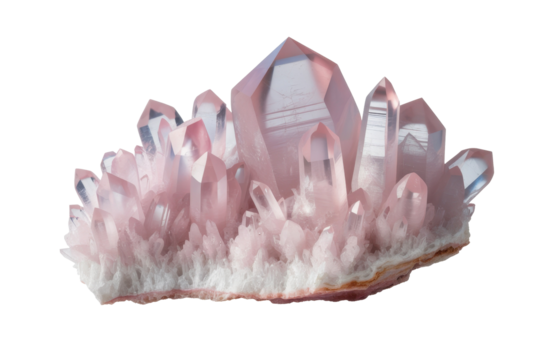 Pink rose quartz crystal tower positioned on dark black stone slate base, isolated on a transparent background