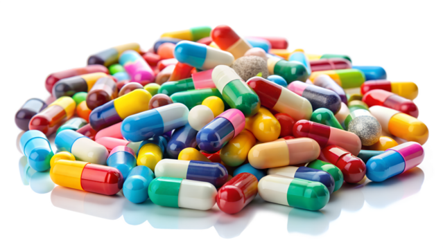 Pile of colorful pills and capsules isolated on transparent background used in pharmaceutical manufacturing and medicine for human and animal health