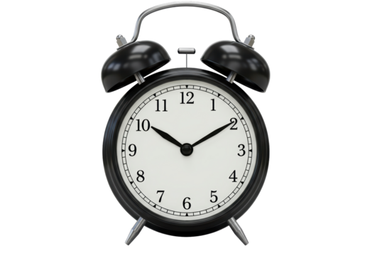 Classic chrome alarm clock showing ten ten on a white face against a stark studio shot on transparent background