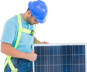 Construction worker examining solar panel