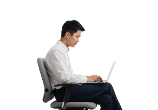 Side view of a young Asian man in formal wear sitting with poor posture while working on a laptop, isolated on a transparent background.