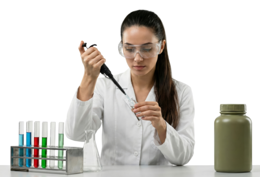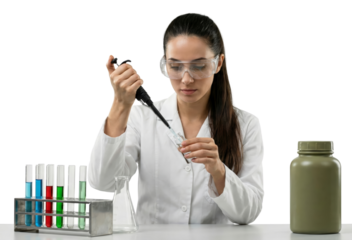 female scientist conducting laboratory experiment with pipette and test tubes isolated transparent